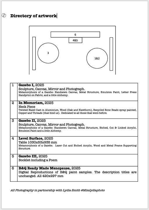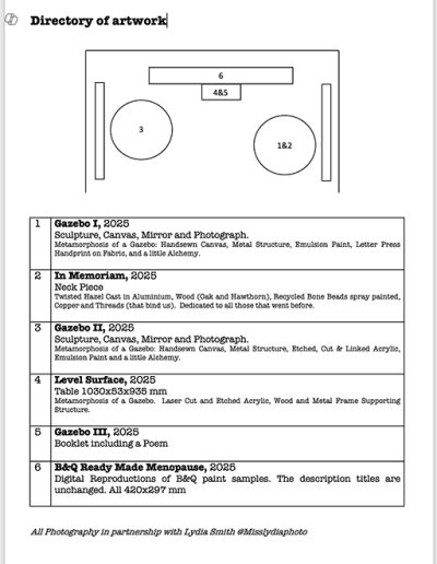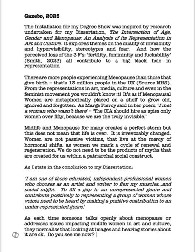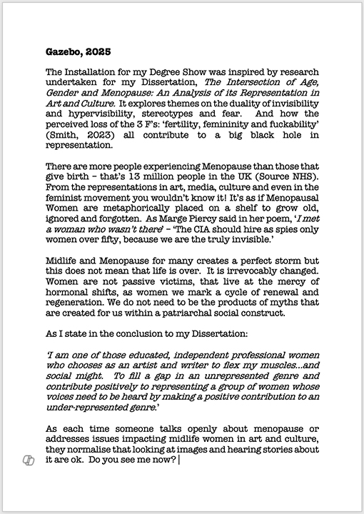 All the artwork in the Installation was inspired by research undertaken for my Dissertation, The Intersection of Age, Gender and Menopause: An Analysis of its Representation in Art and Culture. Exploring themes on the duality of invisibility and hypervisibility, stereotypes, fear and the societal pressure that many mid-life women feel.